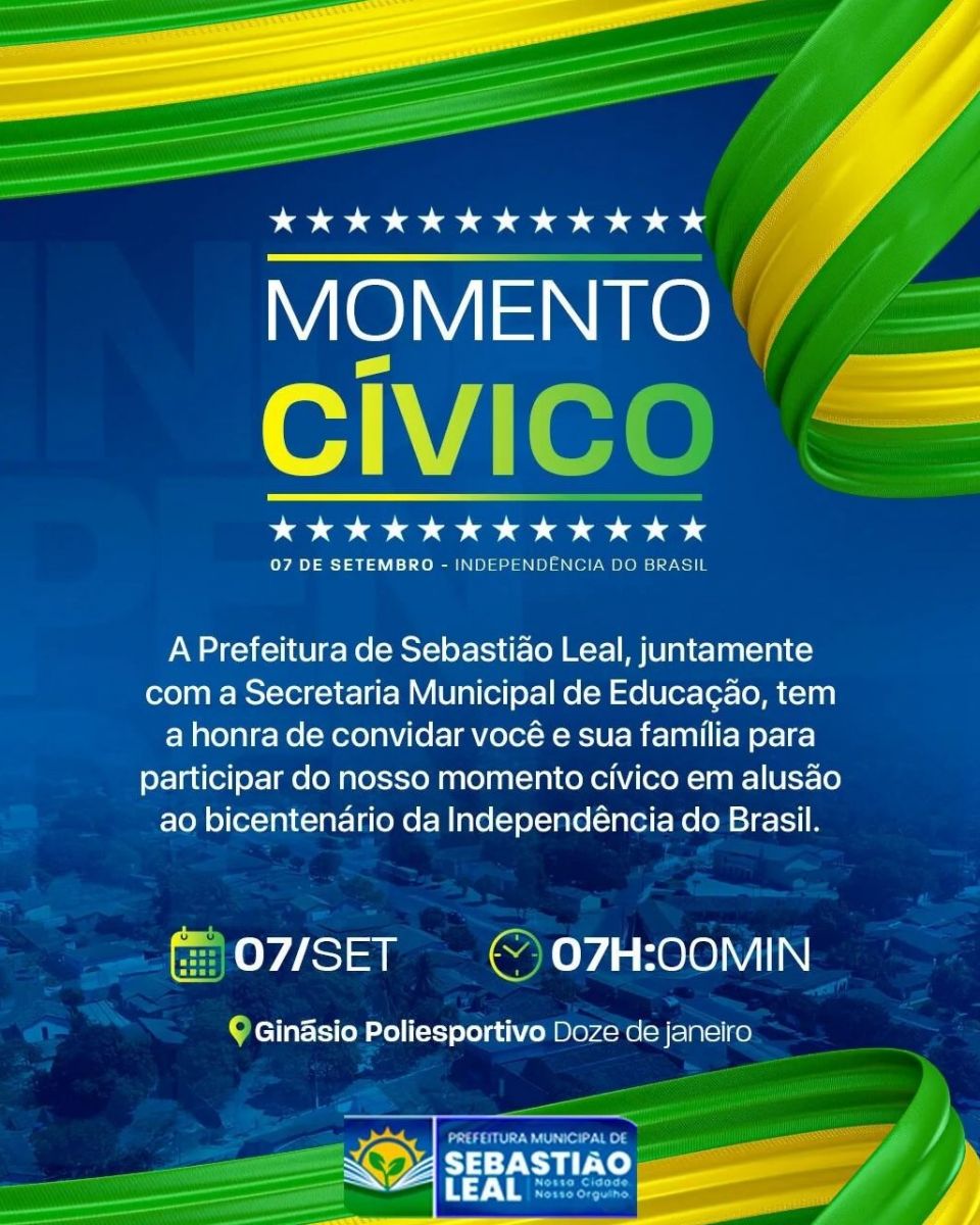 A secretaria municipal de educação juntamente com a prefeitura de Sebastião Leal, tem a honra de convidar você e sua família para participar do nosso momento cívico em alusão o dia 7 de setembro.