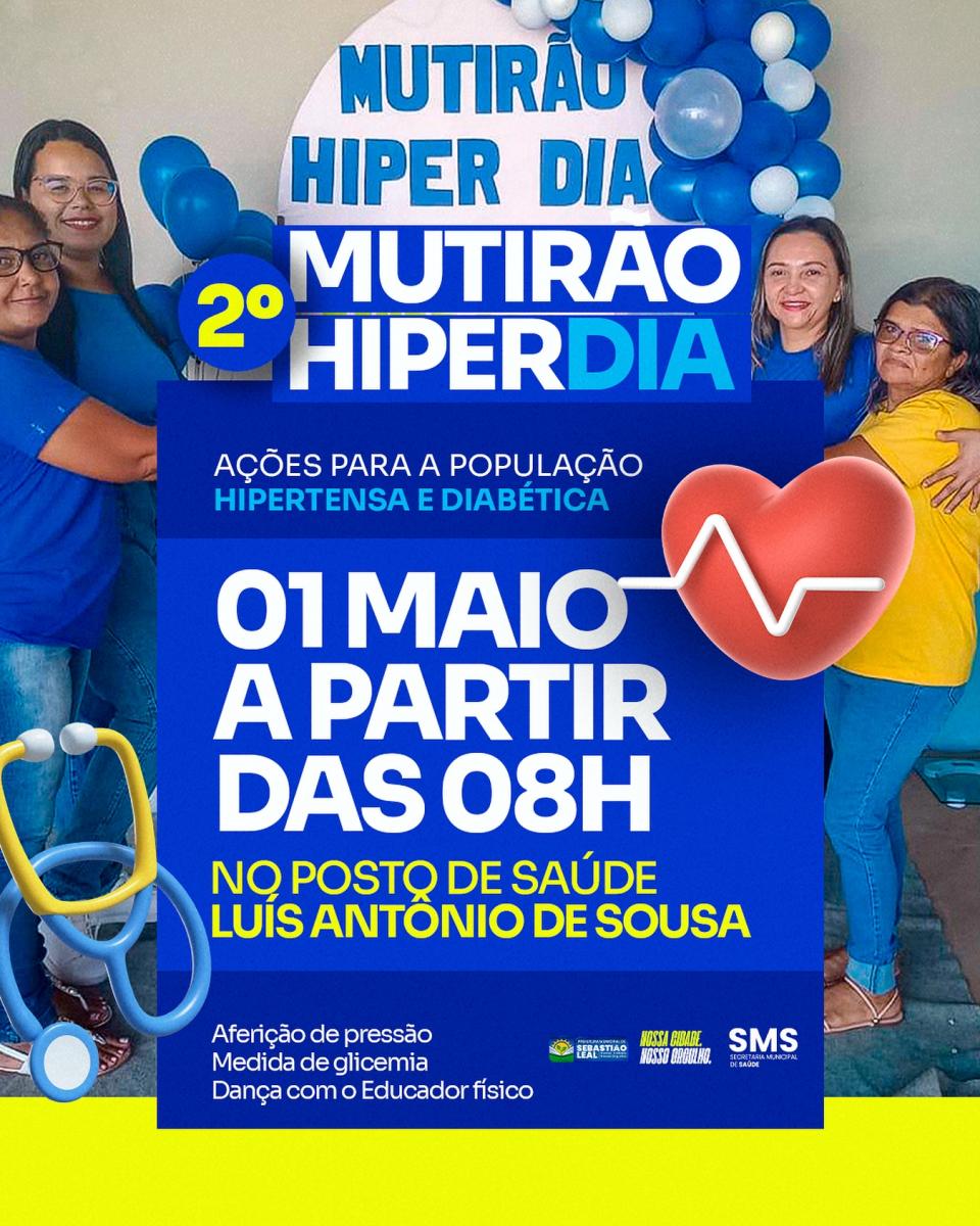 Venha cuidar do seu coração e da sua saúde! ð Participe do 2º Mutirão Hiperdia no dia 01/05/2024, a partir das 8h, no Posto de Saúde Luís Antônio de Sousa. Aferição de pressão, medida de glicemia e muita animação com dança ao lado do Educador Físico. Cuide de você, cuide do seu bem-estar!