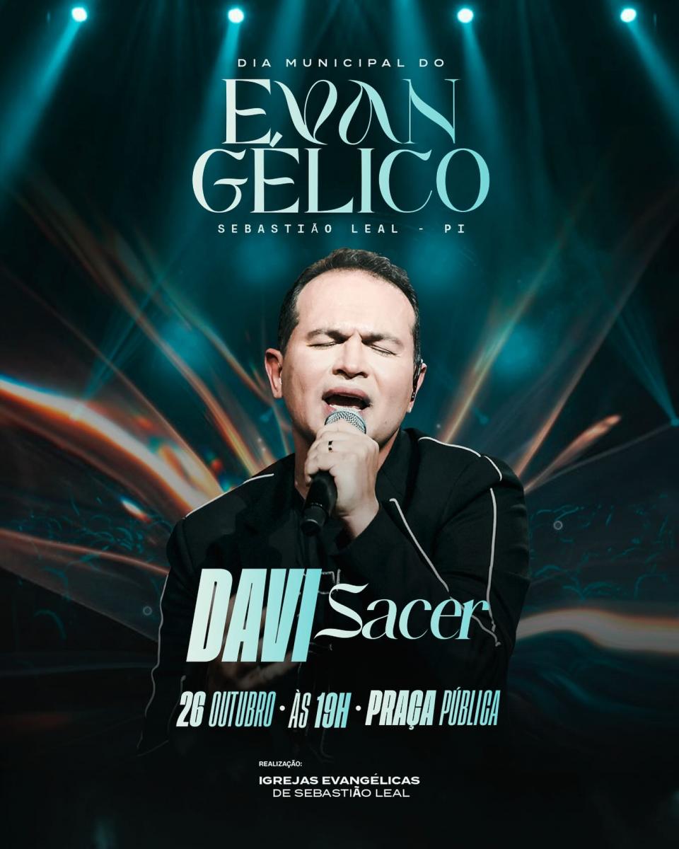 Com grande alegria em nossos corações, vamos celebrar a fé e o amor a Deus através da música! Neste sábado, dia 26 de outubro, Sebastião Leal viverá uma noite inesquecível com o show gospel de Davi Sacer, em comemoração ao Dia Municipal do Evangélico.